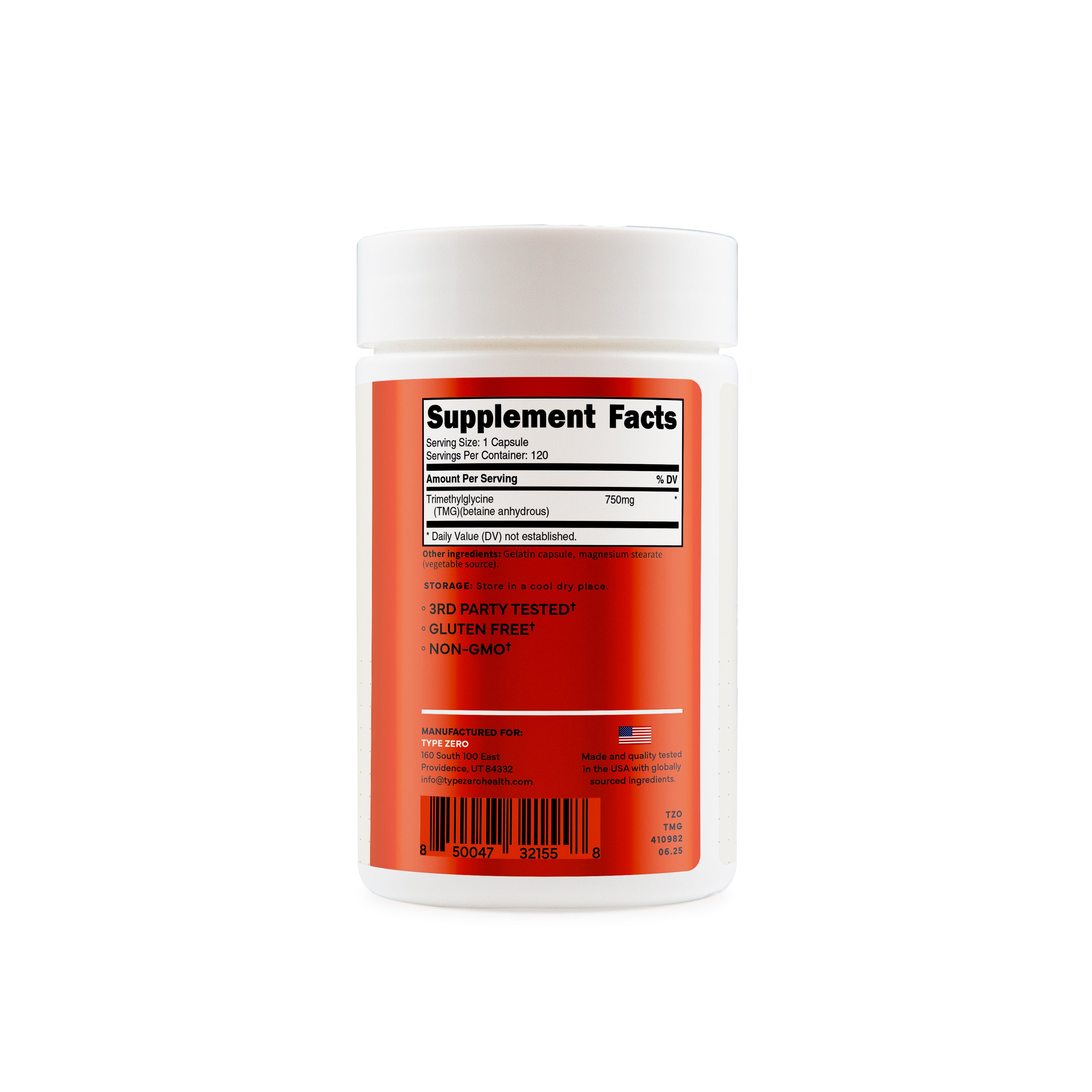 Type Zero TMG provides 750mg of trimethylglycine (TMG) per serving in easy-to-take capsules format. Each bottle includes 120 capsules for 120 servings, offering a straightforward way to add TMG to your daily routine.